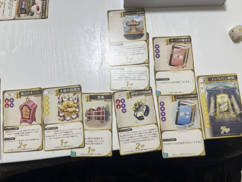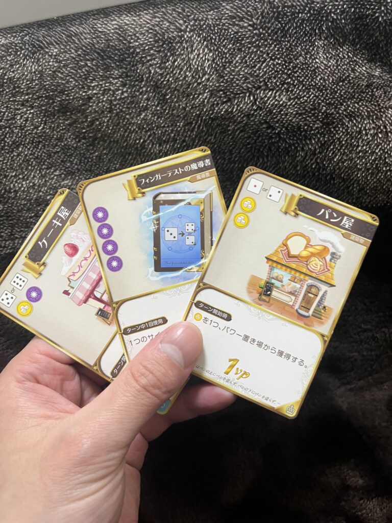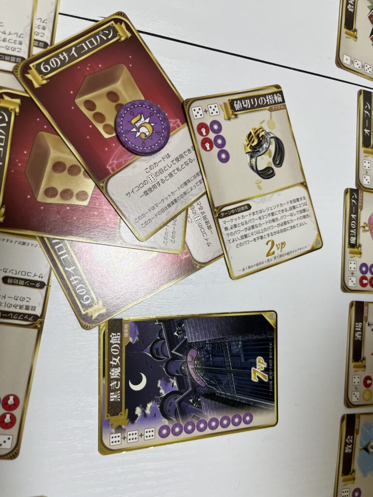 サイコロを振り、各キャラの能力と設置したマーケットカードの能力でパワーチップ(「お金」「権力」「魔力」)やサイコロパンカードを得ます。 - 手番中の行動